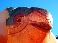 Wings didn't make sense to Patricia; the creature was too big and the technical limitations of balloon design wouldn't allow them anyway. So she took a cue from the balloon itself, and imagined that the creature might somehow secrete a lighter than air gas. In the place of wings she imagined huge udders that might contain the gas, as well as a huge bulbous body. She imagined the creature with a slightly more human face, with a calm benign expression that would inspire empathy rather than fear. Her aim was to create a being that was massive and wondrous and that exists somewhere between the impossible and the unlikely.[6]