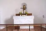 Alterbordet er opført i 1952 i munkesten med kors-relieffer. Alterprydelsen er et sengotisk krucifiks fra 1400-tallet og bærer indskriften: ”I mig skal I have fred”. Alterstagerne er fra 1600-tallet. Kirkens bibel er udgivet af kong Christian VI i 1740. Alterkalken er fra 1878, disken fra 1849 og oblatæsken fra 1965. Over alterbordet er der i korets østvindue indsat en glasmosaikrude fra 1955, udført af kunstneren Harald Borre med motivet ”Krist stod op af døde påskemorgenrøde”.