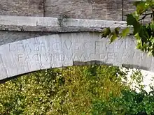 På Ponte Fabricio, rejst i 62 f.Kr, læses en indskrift på latin til minde om bygherren: L . FABRICIVS . C . F . CVR . VIAR | FACIVNDVM . COERAVIT | IDEMQVE | PROBAVIT (= Lucius Fabricius, søn af Gaius, overingeniør for vejene, sørgede for og gav også tilladelse til, at den blev bygget). Sætningen står fire steder, på hver af buerne på begge sider af broen. Man kan også læse, at EIDEMQUE PROBAVIT (= Han testede den selv). [20] En senere indskrift, med mindre bogstaver, beretter at broen blev renoveret under pave Innocens 11., sandsynligvis i 1679.