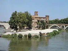 Ponte Cestio forbinder øen med Tiberens vestlige bred, [17] mens Ponte Fabricio - Roms ældste eksisterende bro, også kaldt Ponte dei Quattro Capi (= De fire hoveders bro, efter udsmykningen, der består af to Janus-statuer, hver med to hoveder [18]) - forbinder øen med det centrale Rom. [19]
