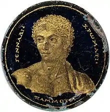 Deres emner ligner katakombemalerierne, men med en forskellig vægtning, med hyppigere portrættering af – antages det – afdøde. Udviklingen i det øgede antal billeder af helgener kan spores her.[42] Den samme teknik begyndte at blive brugt til de små kuber der blev brugt til mosaikker, guld'tesseraer'[note 15] for mosaikudsmykning i midten af 1. århundrede i Rom, og ved det 5. århundrede var de blevet standardbaggrunden for religiøse mosaikker.