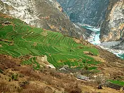 ![]() Ristereasser på bjergside i Yunnan, med Tigerspringkløften nederst. | |