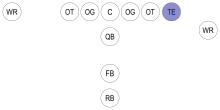 Tight endens typiske position i angrebet (markeret med blåt), yderst på den offensive linje.