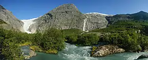 ![]() Tjøtafossen i baggrunden, midt i billedet ved siden af, og under Briksdalsbreen. | |