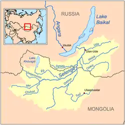 Kort over Selenge-bækkenet Tjikoj (Chikoi) i midten til højre. | |