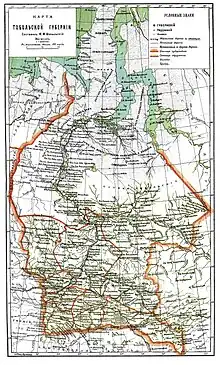 Guvernementet var inddelt i ti distrikter, og de vigtigste byer var Tobolsk (hovedstad), Tjumen, Beresov, Isjim og Kurgan.