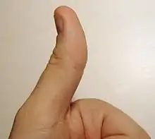 Tommelfingeren anvendes til at markere en positiv holdning eller støtte, når den stikkes opad. Man taler i så fald om at vise "tommelen op" (fra engelsk: "thumbs up").