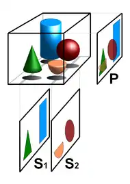 Et snitbillede afspejler de indre strukturer, således at de vil passe udskæringen af et objekt, og skære i en tynd skive. Man taler om en sammenlagringsfri repræsentation af et lag af objektet (i modsætning til normalt, hvor alle strukturer vil være sammenflettet. Denne forskel er vist i det tilstødende billede med to tomografiske afsnits-billeder (S1 og S2) og et sammenflettet billede (P), af det samme volume.)