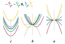 Hvis konstanten ændres, ændrer funktionsværdierne sig lige så meget. Konstanten afgør sammen med , hvor funktionens ekstremum er, mens alene bestemmer krumningen eller den anden afledte, idet: