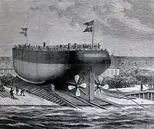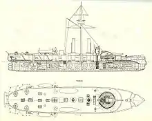 ![]() Tordenskjold i 1884. I perioden 1884-1894 var de danske panserskibe malet lysegrå. | |