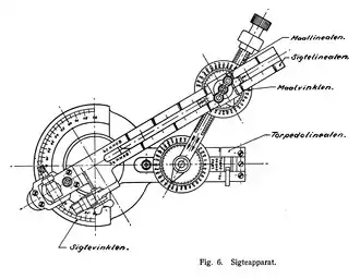 I takt med at torpedoernes hastighed og rækkevidde øgedes, blev der udviklet drejelige torpedoapparater, hvor man kunne sigte mod målet med et særligt sigteapparat, hvor man beregnede vinklerne for affyringen i forhold til målets hastighed og kurs, samt torpedoens hastighed. Sigteapparatet var monteret på torpedoapparatet og forsynet med kikkertsigte, så man fik de bedste muligheder for vurdere målets bevægelser.[40] I tiden op mod 2. verdenskrig udviklede de større flådemagter elektromekaniske apparater til beregning af torpedoernes kurs. Et typisk eksempel var den amerikanske Torpedo Director Mark 27. Den var normalt opstillet på kommandobroen af destroyere, én i hver side, og herfra kunne skibets torpedoofficerer udstikke indstillinger til mandskabet ved torpedoapparaterne. De drejelige torpedoapparater havde mellem et og fem torpedorør, og med flere rør fik man mulighed for at affyre salver, og en torpedo director gav mulighed for at affyre flere torpedoapparater ad gangen mod samme mål.[41]