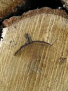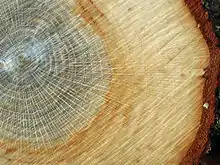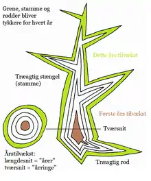 Lagene er ringformede, når vi skærer dem over på tværs. Derfor kaldes de årlige tilvækstlag ofte for årringe. På langs er lagene derimod lange cylindre eller måske kegler med udposninger overalt, hvor der findes levende grene[1][2].