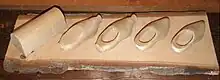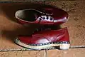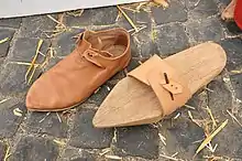 Middelalderlige patiner med hængsling i form af et stykke læder, der giver fleksibilitet i sålen.