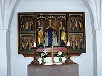 Alterbordet stammer fra restaureringen i 1960-1961 og er udført i poleret, rødbrun Tranåsgranit efter tegning af Johannes Exner. Altertavlen er en sengotisk fløjaltertavle fra slutningen af 1400-tallet og er formodentlig lavet i Lübeck. I midten ses sankt Ursula med 10 af de 11.000 jomfruer. På hendes venstre side står apostlen Johannes med en alterkalk i venstre hånd, mens jomfru Maria med Jesusbarnet på venstre arm er placeret på Ursulas højre side. I fløjenes ses apostlene, hvoraf kun Jakob den Ældre og Johannes kan identificeres ved henholdsvis hatten med muslingeskallen (Ibskal) og alterkalken og det manglende skæg. Tre af de øvrige apostle er udstyret med en posebog.