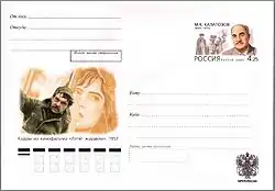 ![]() Fortrykt russisk postkort udgivet i anledning af 100 års jubilæet for instruktøren, Mikhail Kalatozovs, fødsel med afbildning af Boris og Veronika fr filmen Tranerne flyver forbi | |