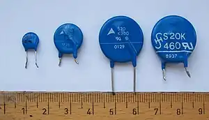 | Metal-oxid varistor (MOV)[3] | Op til 70 kA | @ 100 A, 8x20 µs pulsform: 1.000 transienter | ≈ 1 ns | Typisk 100-1.000 pF | 10 µA |