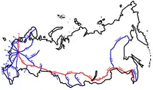 Den transsibiriske vej i rød, med gamle vejnumre