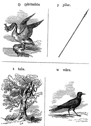 | Gamilaraay | “honning” | wuddul (1903)[4] | warrul (1993)[5] | [waɾul] | Tidlig stavning kunne mangle en klar skelnen mellem [ɾ] og [d], som på engelsk er allofoner, men er forskellige i australske sprog. |