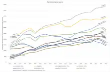 | 10 | Hongkong | Østasien | Perleflodens Delta | 16,685 | 17,798 | 20,070 | 18,361 | 19,596 | 20,770 | 19,813[31] | 20,073[31] | 22,374 | 22,352 | 23,117 | 24,384 | 23,532 | 20,983 | 24,248 | 23,881 | 23,539 | 22,427 | 21,984 | |