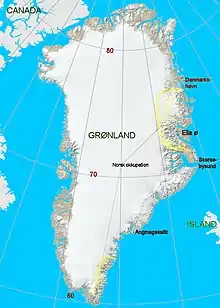 - Fra norsk side blev endnu et stort område i Østgrønland okkuperet den 12. juli 1932, fra Lindenovs Fjord (60° 30' Nord) til Bernstorffs Isfjord (63° 40' Nord). Denne okkupation blev også indbragt af Danmark for domstolen i Haag og blev behandlet sammen med det oprindelige søgsmål