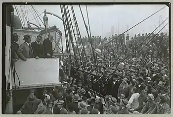 Den 16. juni 1931 var dagen, hvor ekspeditionens 2 skibe sejlede afsted fra Trangraven i Københavns Havn. Det skete under stor bevågenhed. Statsradiofonien var mødt op og sendte fra begivenheden og statsminister Stauning holdt en afskedstale. Kajen og havneområdet var fyldt med folk, der på nærmeste hold, ville bevidne afrejsen.[21] Turen gik først over Færøerne, hvor 4 grønlandske deltagere med deres hunde og slæder var blevet sejlet til fra Vestgrønland. Skibene sejlede derefter videre til Island, hvor der blev lastet kul til dampskibene. Herefter gik det igen nordover langs pakiskanten indtil man fik forceret isbarrieren og arbejdet sig vestover gennem isflagerne frem til Clavering Ø's sydligste fremspring: "Eskimonæs", som man nåede i begyndelsen af august 1931. [22] Her gik man i gang med at opføre den første overvintringsstation med radiosender. [lower-alpha 12][23] Efter at have losset bygningsmateriale drog "Gustav Holm" videre sydpå, for inden hjemrejsen 3 uger senere, at opføre de 2 mindre rejsehuse, et i Nordfjorden og et i Cap Brown, samt den anden store overvintringsstation på Ella Ø, som de nåede frem til den 13. august 1931.