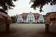Gårdbygningen er konstruert som trefløjet, grundmuret anlæg med en klar deling mellem beboelseshus og økonomibygninger. Hovedbygningen ligger efter forebillede fra herregårdene centralt for enden af gårdspladsen på en relativ høj sokkel med muret trappe og en bred kvist midtpå, den blev flankeret af stalden til den ene og laden til den anden side. Den nye byggeskik i det østlige Angel opstod parallelt med skiftet i boligkultur, klædedragt og ikke mindst sproget (fra dansk / angeldansk til tysk / nedertysk i løbet af 1900-tallet) og markerede en ny urban præget kultur blandt de mere velhavende angelbønder. Senere bredte de trefløjede gårde sig også til Als og Sundeved.