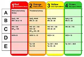 - Vitalparametrene : (luftvej, saturation, respirationsfrekvens, puls, blodtryk, Glasgow Coma Score (GCS), temperatur) indsættes i triageringsskemaet. : (danske udtryk her: "En landsdækkende triagemodel – en optimering af det samlede patientforløb" af Jørn Munkhof Møller, Ledende overlæge Akut‐ og Traumecenter, Aalborg Sygehus (Side 12: "Nationale grænser for Vitalparametre" med de danske betegnelser)