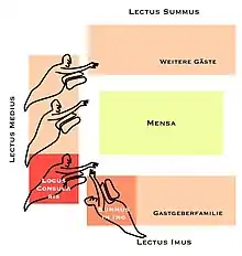 Der lå aldrig mere end ni personer ved hvert triclinium, men der kunne anbringes flere i samme sal. Navnet triclinium blev også brugt om spisesalen.