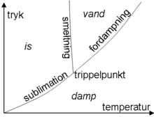 I et koordinatsystem, hvor temperaturen er abscisse og trykket er ordinat, vil de to tilstandsovergange kunne tegnes som to linjer. Området mellem de to linjer svarer til tilstandsformen vand, og på hver side af dette område har vi hhv. is og damp. Linjerne vil mødes i et fælles endepunkt, og herfra udgår endnu en linje. Denne linje angiver overgangen mellem is og damp, som kaldes sublimation. Dette punkt, hvorfra der altså udgår tre linjer, kaldes tripelpunktet. Det ligger for vand ved 0,01 °C og 611,657 ± 0,010 Pa.