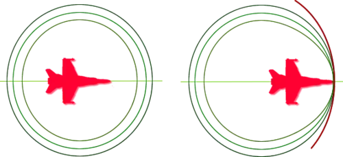 Princippet i når et fly bryder gennem lydmuren. Til venstre ses et fly, hvor lydbølger udbredes rundt om flyet. Til højre ses et fly, hvor spidsen rører ved lydmuren (rød).