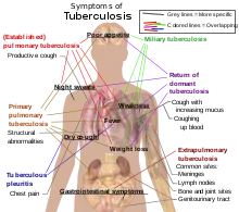 Mellem fem og ti procent af de TB-ramte, der ikke har HIV, udvikler den aktive sygdom på et tidspunkt i livet.[8] Dette tal er 30% for HIV-smittede TB-patienter.[8] Tuberkulose kan forekomme overalt i kroppen, men det ses hyppigst i lungerne (lungetuberkulose eller pulmonal tuberkulose).[9] Tuberkulose uden for lungerne kaldes ekstrapulmonal tuberkulose, som godt kan forekomme sammen med pulmonal tuberkulose.[9] Almindelige tegn og symptomer omfatter feber, kulderystelser, nattesved, tab af appetit, vægttab og træthed.[9] Patienten kan udvikle såkaldte trommestikfingre i udpræget grad.[8]