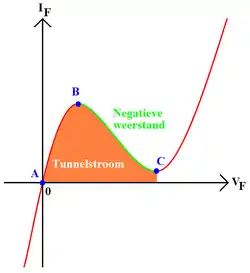 Strøm- Spændingskarakteristik for en tunneldiode. Den grønne grafstrækning er der hvor tunneldioden udviser negativ differentiel modstand.