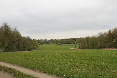 Tusindårsskoven set fra stien langs jernbanen. Højhusene i det fjerne er en del af Odense Universitetshospital.