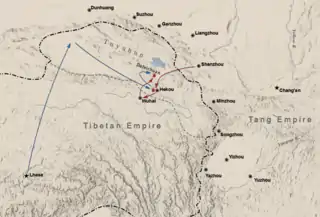Det tibetanske imperium udviklede sig hurtigt under ledelse af Songtsen Gampo, som forenede tibetanerne og udvidede nordpå, og direkte truede Tuyuhun-imperiet. Kort efter, at han overtog tronen over Yarlung-kongeriget i det centrale Tibet i 634, besejrede han Tuyuhun nær Qinghai-søen og modtog en udsending fra Tang.[9] Den tibetanske kejser anmodede om ægteskab med en kinesisk prinsesse, men blev afvist. I 635-6 besejrede Tang-kejseren den tibetanske hær, men efter denne kampagne[10] indvilligede den kinesiske kejser i at give en kinesisk prinsesse til Songtsen Gampo.[11]