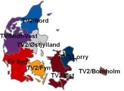 TV 2/Nord er målrettet seere i Nordjylland. TV 2/Midt-Vest er for midt- og vestjyder. TV 2/Østjylland er regionen for seere i Østjylland. TV Syd er for Syd- og Sønderjylland. TV 2/Fyn er som navnet antyder for fynboere. TV 2/Øst er for borgere på Midt-, Vest- og Sydsjælland samt øerne. TV 2/Bornholm er for seere på Bornholm, mens TV 2 Kosmopol er for hovedstadsområdet inklusiv Nordsjælland.