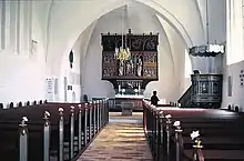 Fløjaltertavlen med skårne figurer er sengotisk og dateres til omkring 1480, den er muligvis skåret af Bernt Notke; i midterskabet ses Nådestolen flankeret af Maria og Johannes, i fløjene ses apostle og fire gejstlige helgener, i fodstykket ses Pieta og otte nødhjælpere, baldakinen er tilføjet senere, den bærer våben for Peder Rosenørn og Anna de Hemmer. Altertavlen blev restaureret i 1691 under Peter Rosenørn og i 1858 under lensgreve Emil Frijs til Frijsenborg. Prædikestolen er fra omkring 1620, i felterne se malerier af Ingolf Røjbæk fra 1956. På østfagets nordvæg ses epitafium over Peder Rosenørn (død 1706) og Anna de Hemmer.
