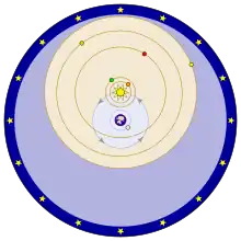 Illustration af det Tychoniske system. Solen kredser om Jorden, men de andre planeter, kredser om Solen.