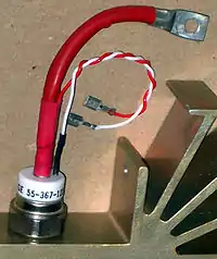 En SCR dimensioneret til omkring 100 ampere, 1200 volt monteret på en køleplade – de to små tilledninger er gate trigger ledningerne.