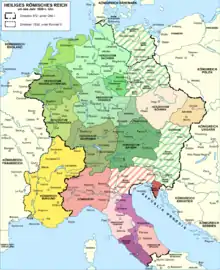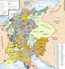 ![]() Tysk-romerske rige omkring 1600, lagt over de nuværende europæiske staters grænser.  | |||||||||||||||||||||||||||