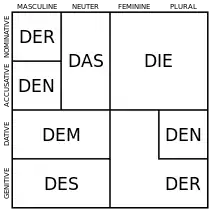 - et af fire kasus: nominativ, akkusativ, genitiv og dativ.