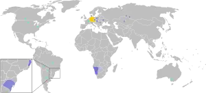 | Officielt sprog i: | der ud over i 6 lande/regioner: Officiel status i 4 områder: