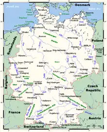Næsten hele Tyskland ligger indenfor afvandingsområdet af de seks store floder Rhinen, Donau, Elben, Oder, Weser og Ems. Donau er med sine 2.845 km fra kilden i Donaueschingen til udløbet i Sortehavet Europas næst længste flod (efter Volga). Den tyske del af Donau er 687 km lang. De fem andre floder løber ud enten i Nordsøen eller i Østersøen; altså går det Europæiske hovedvandskel gennem Tyskland. Dette vandskel går fra øst for Oberrheingraben over Schwarzwald og de schwabiske- og frankiske alper.