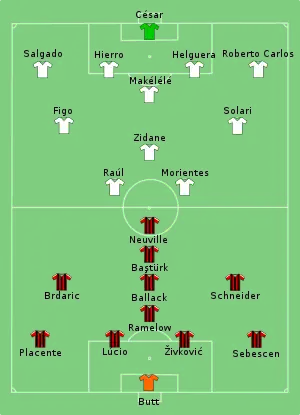 Bayer Leverkusen var før kampen undertippet, og ikke mange levnede holdet nogle chancer mod det spanske storhold. Allerede efter otte minutter åbnede Raúl scoringen, da han bragte Real Madrid foran med 1-0. Men fem minutter senere udlignede brasilianer Lúcio med sit mål til 1-1. Kampens højdepunkt kom i 1. halvlegs sidste minut, da verdens på daværende tidspunkt, dyreste fodboldspiller Zinedine Zidane scorede til 2-1 for Real Madrid på et flot mål. Efter et indlæg fra Roberto Carlos, sparkede Zidane med venstrebenet over hoftehøjde, bolden hårdt op under overliggeren uden chance for målmand Hans-Jörg Butt.[1]