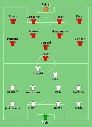 Foran 63.000 tilskuere tog AC Milan tog føringen i det 45. minut, da et frispark fra Andrea Pirlo blev dirigeret i mål af Filippo Inzaghi. Efter 82 minutter var Inzaghi igen på pletten, da han øgede italienernes føring til 2-0. Dirk Kuijt reducerede i de sidste minutter for Liverpool, men holdet var ikke i stand til at score mere, og Milan vandt kampen 2-1 samt deres syvende Champions League titel.