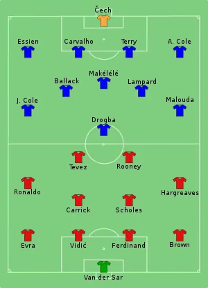 For Manchester havde manager Alex Ferguson på forhånd garanteret veteranen Paul Scholes en plads i startopstillingen, da denne i klubbens seneste Champions League-finale i 1999 var udelukket på grund af karantæne.[8] I øvrigt var holdopstillingerne for begge mandskaber ret forudsigelige i lyset af deres seneste kampe.