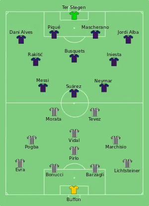 - "Tactical Line-ups – Final – Saturday 6 June 2015" (PDF). UEFA.com. Union of European Football Associations. 6. juni 2015. Hentet 9. juni 2015.
