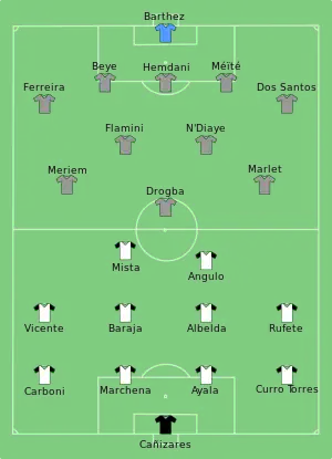 På grund af kraftig vind var der ikke de store målchancer i 1. halvleg, før i de allersidste sekunder. Marseilles målmand Fabien Barthez nedlagde Mista i straffesparksfeltet, hvilket dommere takserede til direkte rødt kort og straffespark til Valencia. Dette omsatte Vicente til en spansk 1-0 føring, lige inden spilleerne gik til pause. I 2. halvleg havde Valencia kontrol med kampen, og efter 58 minutter øgede Mista føringen til 2-0, hvilket også blev kampens resultat.