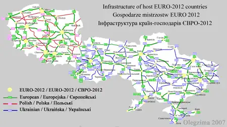 Bortset fra Donetsk og Kharkiv er alle værtsbyerne populære turistdestinationer.[1] De obligatoriske forbedringer af infrastrukturen omfatter byggeri af seks nye stadions, mens de sidste to stadions i Poznań og Kharkiv undergår omfattende renoveringer.[2] Tre stadions vil leve op til kriterierne i UEFA's højeste stadionkategori.