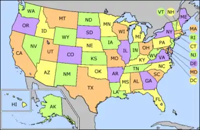 Hver delstat har en forkortelse på to bogstaver, som bruges ved det amerikanske postvæsen. De er angivet nedenfor. Se engelsk Wikipedia for detajler: List of U.S. state and territory abbreviations.