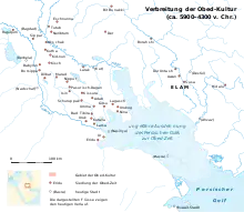 - Ubaid 3/4, også kaldet Ubaid I og Ubaid II[8] - I perioden 4.500-4.000 f.Kr. indtraf en periode med intens og hurtig urbanisering, hvor Ubaid-kultur spredes ind i det nordlige Mesopotamien og blev adopteret af Halaf-kulturen.[9][10] Ubaid genstande spredtes også langs den arabiske kystzone, der viser væksten i et handelssystem, der strakte sig fra Middelhavskysten gennem området til Oman.[11][12]